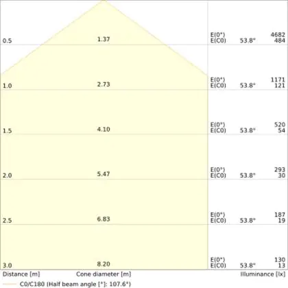 Der Abstrahlwinkel bezeichnet den Winkel, in dem das Licht aus der Lichtquelle ausgestrahlt wird. Er wird in Grad (D) angegeben. Je geringer die Gradzahl des Abstrahlwinkels ist, desto kleiner ist auch der Durchmesser des Lichtkegels, den die Lichtquelle produziert. Beispiel: Wird eine Lampe mit einem Abstrahlwinkel von 60 Grad an der Decke (2,5 m Höhe) angebracht, erzeugt sie einen Lichtkegel von 2,9 Metern Durchmesser. Hat die Lampe hingegen einen Abstrahlwinkel von 120 Grad, beträgt der Lichtkegel 8,7 Meter im Durchmesser. |