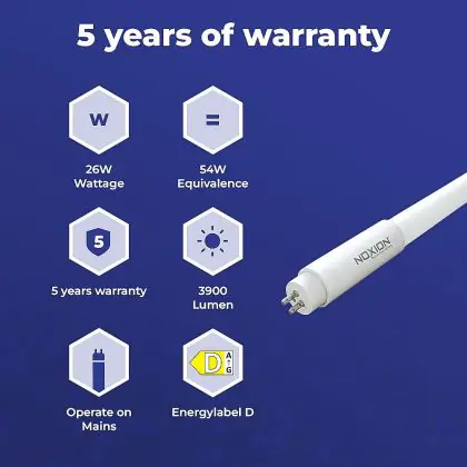 Wir von BeleuchtungDirekt haben mit der T5 LED-Röhre von Noxion gute Erfahrungen gemacht. Daher bieten wir Ihnen für dieses Produkt eine Garantie von 5 Jahre an.
