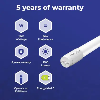 Die T8 LED-Röhre von Noxion kann nicht nur mit einer langen Lebensdauer von 50000 Stunden, sondern auch mit einer hohen Lumeneffizienz von lm/W überzeugen. Sie strahlt ihr Licht in der Farbtemperatur 3000K - Warmweiß aus und wird mit betrieben. Im Preis ist zudem eine All-In-Garantie von 5 Jahre Jahren enthalten.