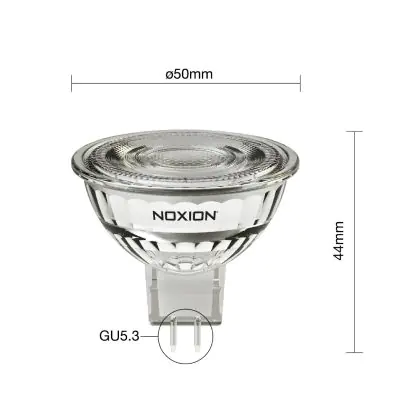 Die Noxion LED-Spot GU5.3 MR16 4.4W 345lm 36D - 830 Warmweiß | Ersatz Für 35W ist eine effiziente GU5.3 LED-Lampe. Das Produkt der Marke Noxion ist der perfekte Ersatz für Ihre konventionelle Halogenlampe mit 35W und einem GU5.3-Sockel, bei dem die beiden Stifte einen Abstand von 5,3 mm zueinander haben. Die Abkürzung MR16 zeigt Ihnen, dass der Reflektor einen Durchmesser von 5 cm hat. Zudem strahlt das Produkt Licht in der Farbtemperatur 3000K - Warmweiß aus und punktet durch eine lange Lebensdauer.